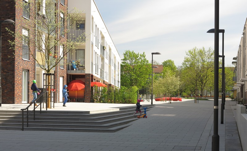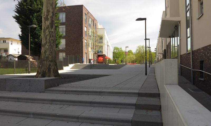 lichen Platzbereich vermitteln Stufen zum Erdgeschossniveau der Nordzeile. Das Vorfeld des Nachbar-