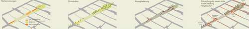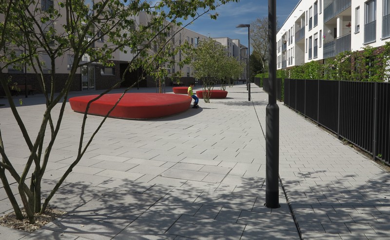 zug-Spots', als differenziert behandelte mit Sitzmauern eingefasste Pflanzflächen, die insgesamt eine hohe