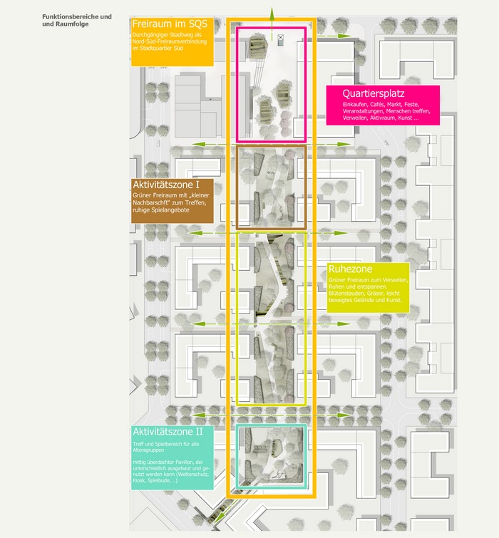 Freiraum bestehend aus Quartiersplatz, Grüner Verbindungszone und Spielbereich.Kooperation:
