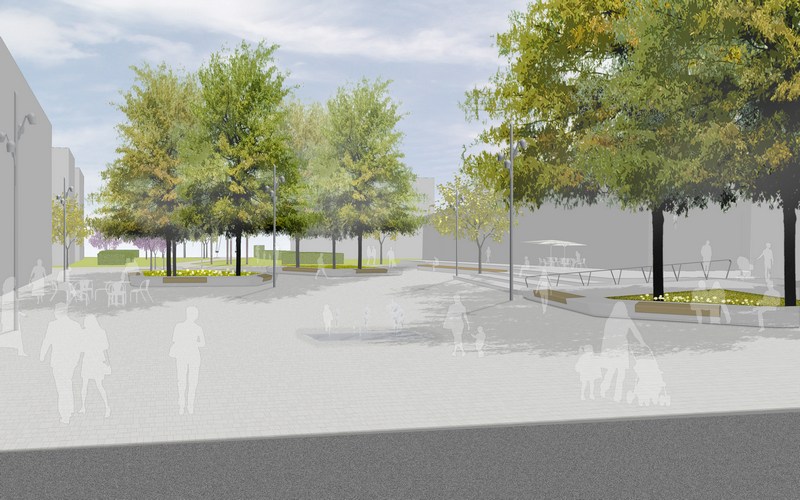 Entwurf der Freianlagen für ein neues Stadtquartier ín Neu-Isenburg.